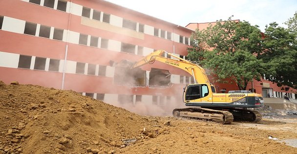 Çayırova Belediye Başkanı Şevki Demirci, Kent Meydanı projesi için başlayan çalışmaları yerinde incelemek üzere geldiği proje alanında iş makinesinin başına geçerek, Fevzi Çakmak Anadolu Lisesi’nin yıkımına başladı.