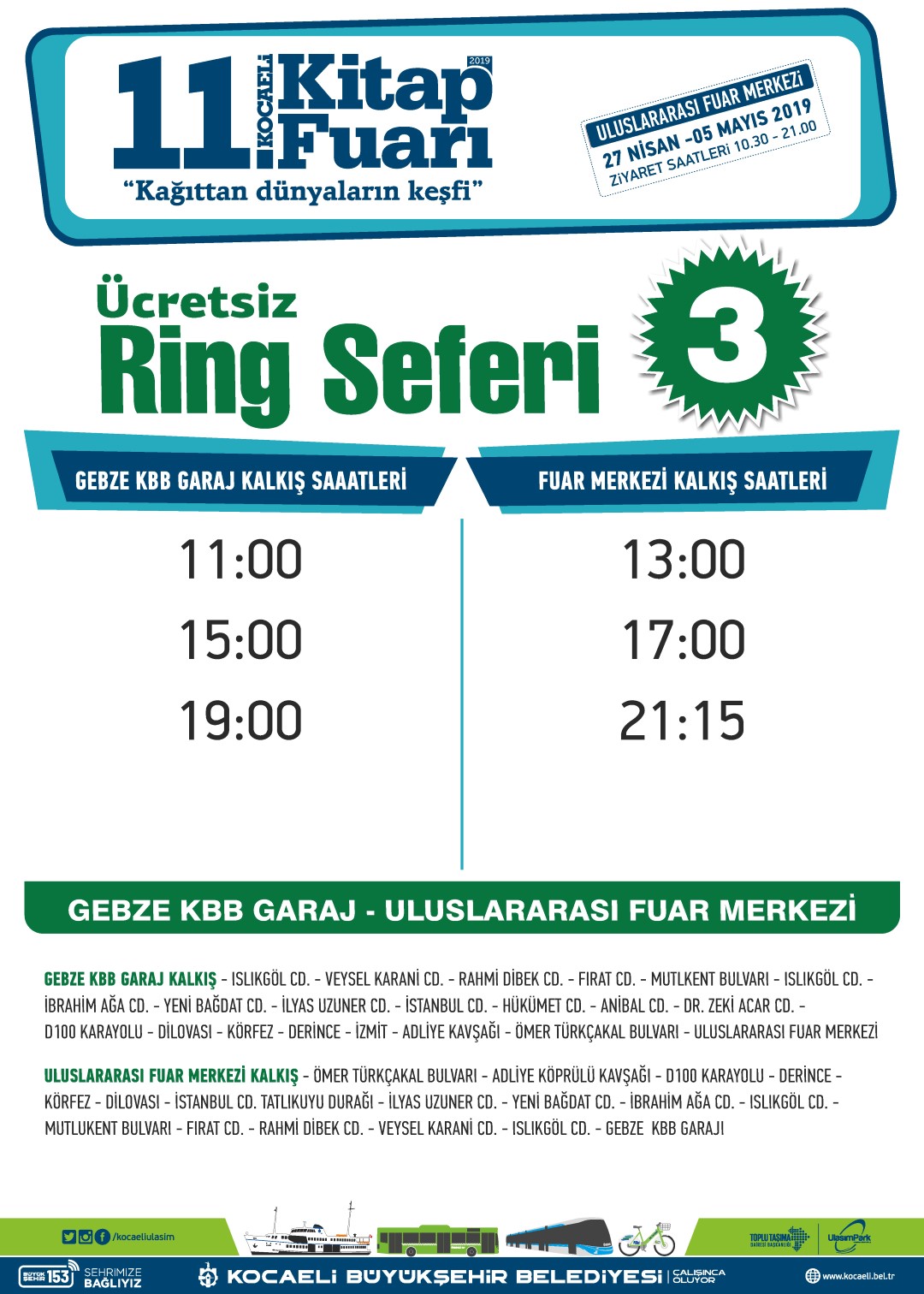 Öte yandan Büyükşehir Belediyesi Gebze’den Kitap Fuarı’na gelecek kitapseverleri de unutmadı. Gebze’den saat 11.00’da sefere başlayacak ücretsiz ring seferleri belirlenen saatlerde kitapseverleri kitap fuarına ücretsiz taşıyacak. Fuar Merkezi’nden ise saat 13.00’de başlayacak servisler 21.15’a kadar Gebze’ye ulaşım sağlayacak.