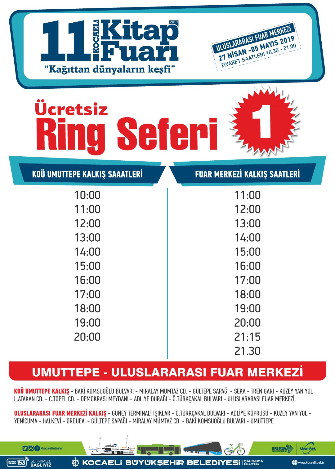 11. Kocaeli Kitap Fuarı boyunca 27 Nisan - 5 Mayıs tarihlerinde servis araçları KOÜ Umuttepe Kampüsü’nden 10.00-20.00 saatleri arasında saat başı hareket edecek. Büyükşehir’in ring otobüsleri Fuar Merkezi’nden KOÜ Umuttepe Kampüsü’ne gidecek üniversite öğrencilerini 11.00-21.30 saatleri arasında taşıyacak.