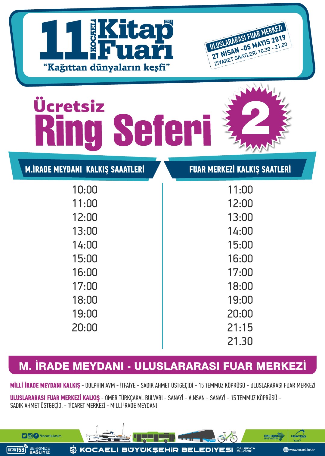 Kitap fuarı boyunca servis araçları İzmit Milli İrade Meydanından 10.00 20.00 - saatleri arasında Uluslararası Fuar Merkezi’ne ve Uluslararası Fuar Merkezi’nden İzmit Milli İrade Meydanı’na 11.00 – 21.30 saatleri arasında ücretsiz ring seferleri yapılacak.
