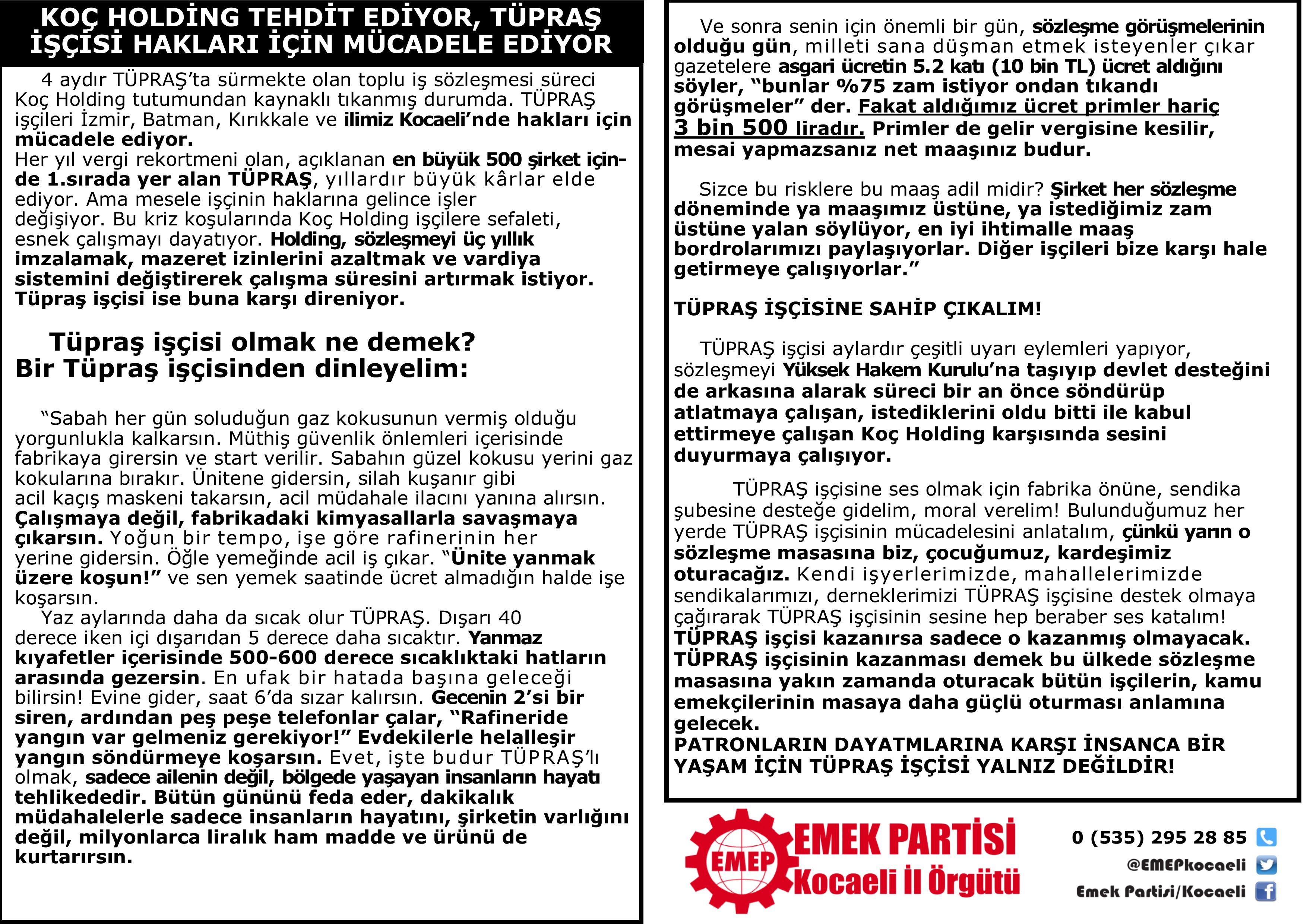 Fabrika önlerinde, işçi duraklarında ve emekçi semtlerde hazırladıkları iki farklı bildiriyi Kocaelili vatandaşlara ulaştıran Emek Partililer (EMEP) TÜPRAŞ işçilerinin haklı mücadelesi için dayanışmaya çağırıyor.