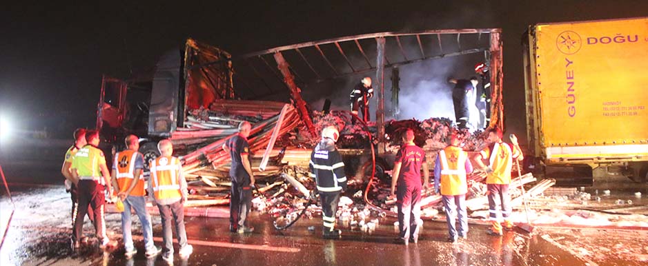 Durumu fark eden sürücü kamyonu yolun kenarına park ederek, alevleri kendi imkanlarıyla söndürmeye çalıştı.