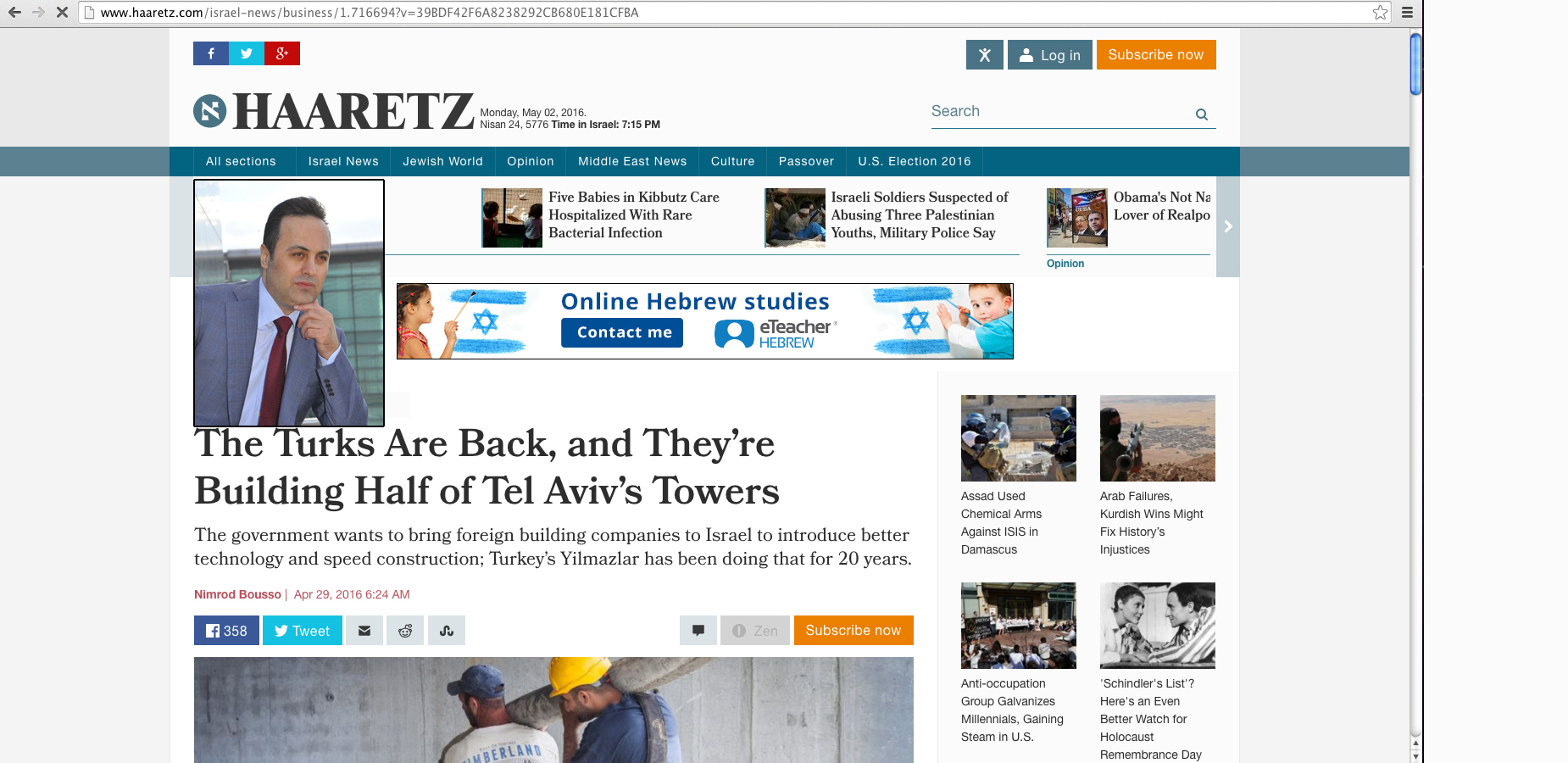 İşte Haaretz’de yer alan ‘Türkler geri döndü, Tel Aviv’in kulelerin yarısını yapıyorlar’ başlıklı makale: