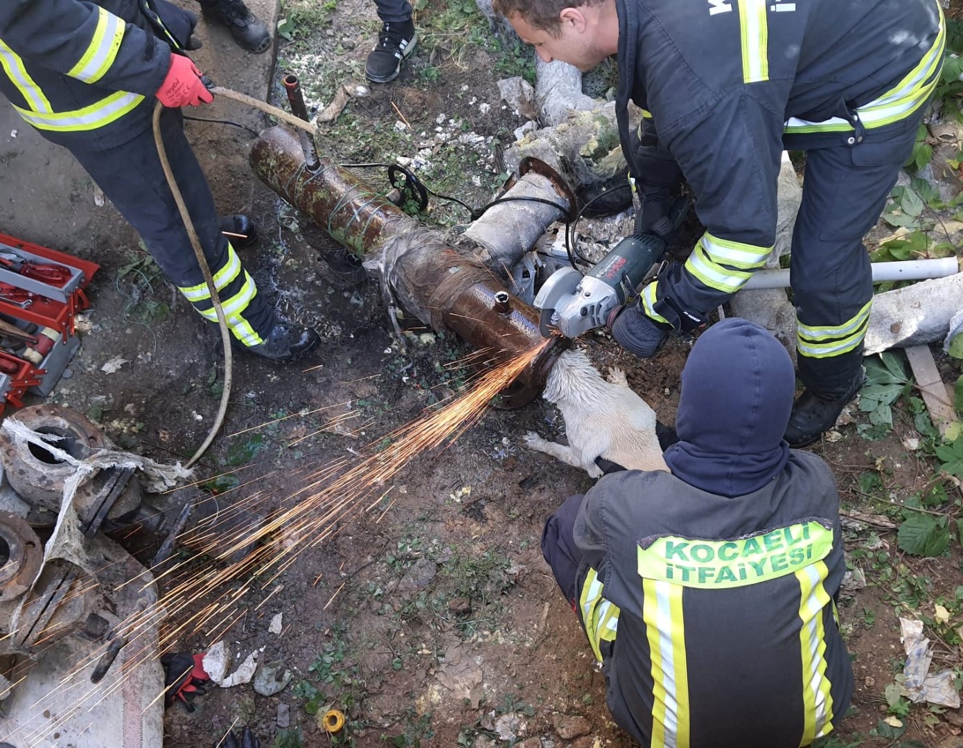 Köpeğin sıkıştığı demir boru hayvana zarar verilemeden taş motoru ile kesildi. Sıkıştığı yerden yara almadan kurtarılan köpek, sağlık kontrolü için veteriner ekiplerine teslim edildi.