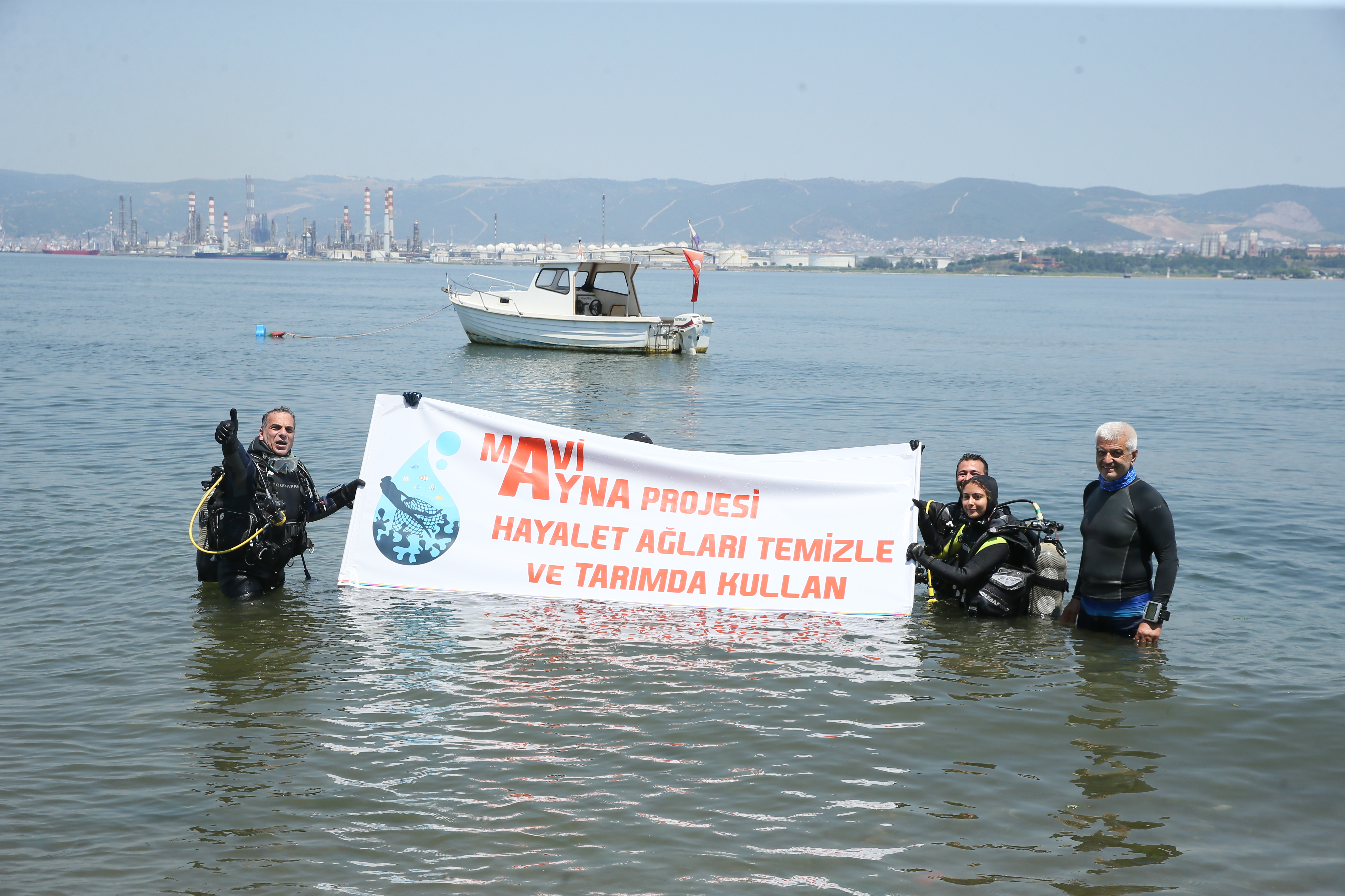 Suyun yaklaşık 15 metre derinliğindeki hayalet ağları toplayan Demirel, beraberindeki dalıcıların yardımıyla Değirmendere Çınarlık sahiline çıkarttı.