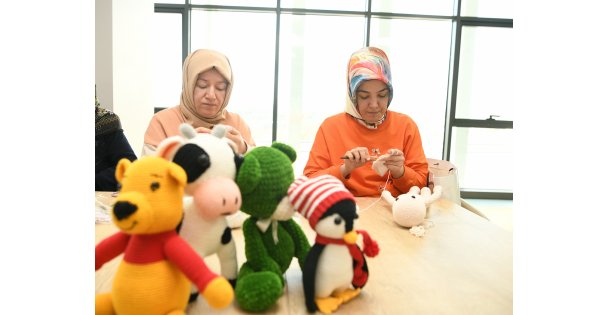 Çayırova Belediyesi'nin örgü kursuna katılan kursiyerler depremzede çocuklar için atkı, bere, patik ve oyuncak örüyor.