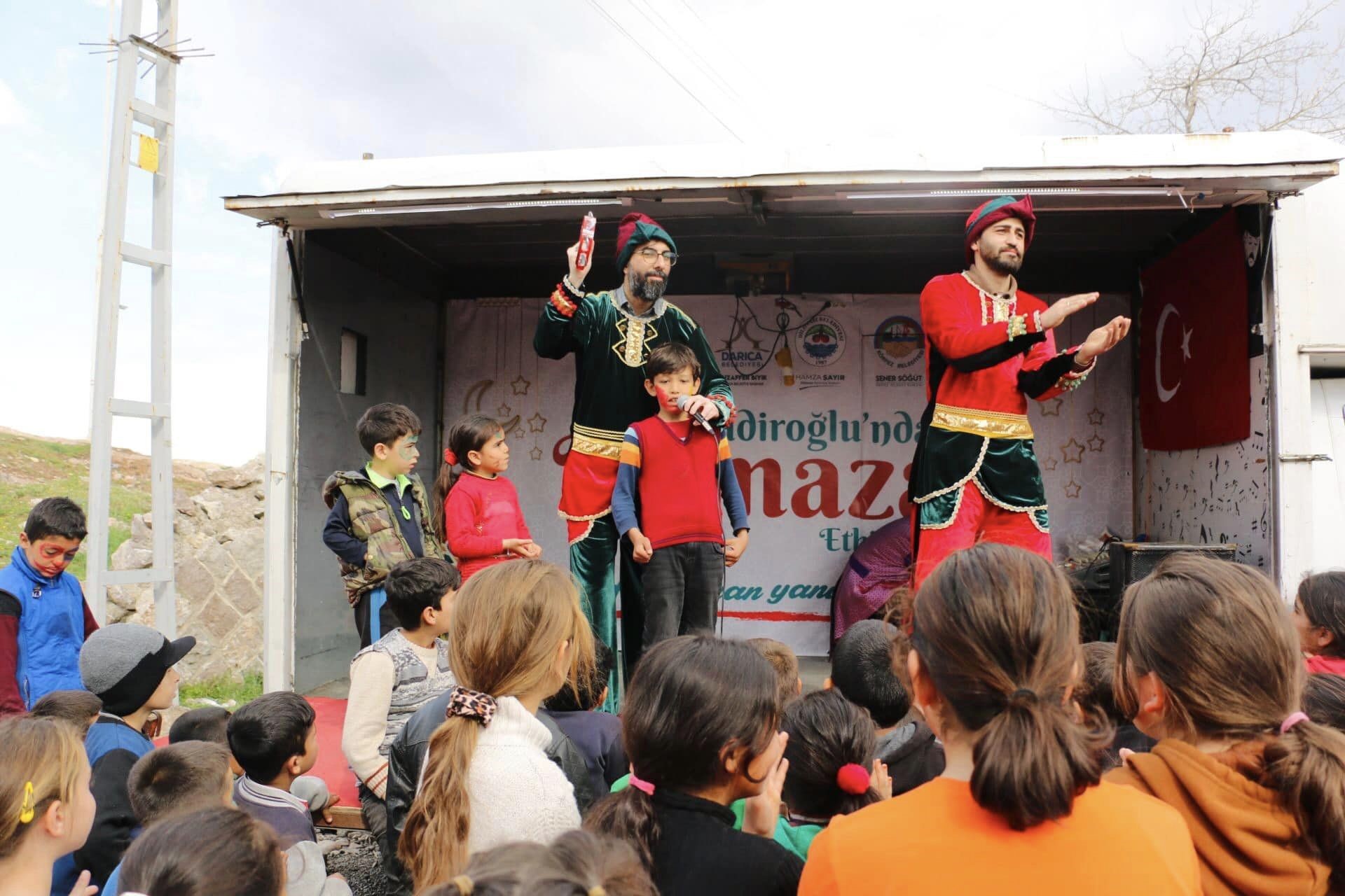 Körfez Belediyesi, Darıca Belediyesi ve Dilovası Belediyesi, Ramazan coşkusunu Kahramanmaraş’ta yaşatıyor. Acıları biraz olsun sarmak için çocuklara özel eğlenceler düzenleniyor. Dulkadiroğlu ilçesine bağlı Elmalar Mahallesi’ne giden seyyar eğlence ekibi, çocukları doyasıya eğlendirdi. İnteraktif masalların anlatıldığı, fıkraların havada uçtuğu programda çocuklar da mikrofonu eline aldı. Körfez Belediye Başkanı Şener Söğüt, Dilovası Belediye Başkanı Hamza Şayir ve Darıca Belediye Başkanı Muzaffer Bıyık da çocukların eğlencesine ortak oldu. Çocuklara ikramların da yapıldığı programda konuşan Başkan Söğüt, "Çocuklarımızın yüzü gülsün bize yeter" dedi.