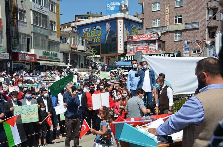 Yapılan konuşmalarda İsrail’in Filistin halkına ve Mescid-i Aksa’ya yaptığı baskın ve zulüm örnekleriyle anlatılarak Belediye Önündeki dev ekranda sinevizyon ekranına yansıtıldı.