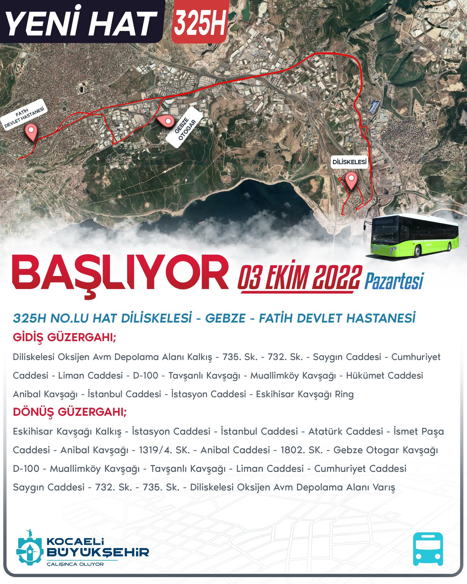 Ø 303 nolu Diliskelesi – Gebze hattımıza alternatif olarak hizmet veren 325 nolu Diliskelesi – Gebze – Çağdaşkent hattımızın güzergahı değiştirilerek 303 nolu hattın güzergahı gibi Gebze içerisinde Anibal Kavşağından sonra kuzey yan yoldan Fatih D.H. – İlyas Uzuner Cd. – Şht. Numan Dede Cd. Ve Mustafa Paşa Camisinden mevcut güzergahına katılacak şekilde hizmet verecektir. Ayrıca 325H koduyla 3 araç ile yeni bir hat oluşturulacak ve 303 nolu hattın güzergahında Diliskelesi – Fatih D.H. arasında hizmet sunulacaktır.