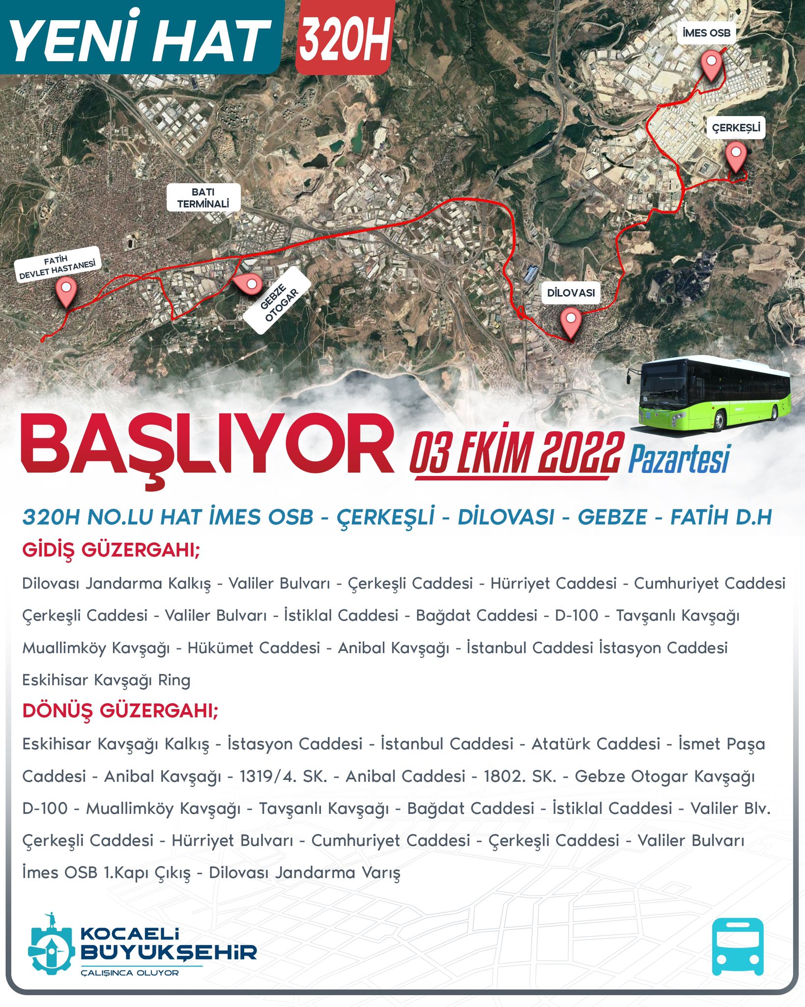 Ø 302 nolu İmes – Gebze ÖHO hattı hizmet vermeye devam edecektir. Ancak hatta çalıştırılacak araç sayısının azalacak olması sebebiyle alternatifi olarak hizmet veren 320 nolu belediye otobüs hattımıza 3 araç ilave edilecektir. Bu araçlar ilave edildikten sonra araç sayısı 6 ya çıkan hatta 4 araç ile 320 -İMES – Gebze- Çağdaşkent arasında 2 araç ile 320H – Dilovası Kaymakamlık – Fatih D.H. arasında toplu taşıma hizmeti verilecektir.