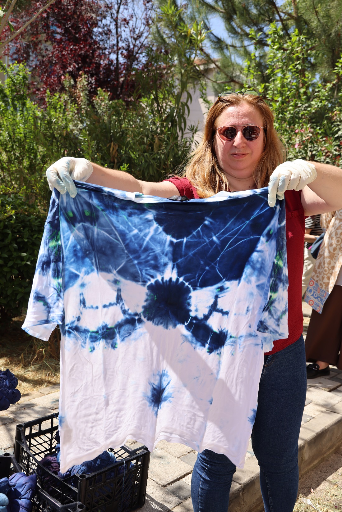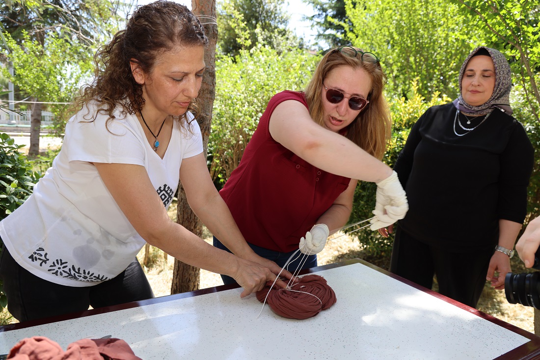 İkinci uygulamada ise Anadolu’ya özgü yerli bitkisel boyar maddelerle gerçekleştirilen geleneksel kökboya çalışmaları yer aldı. Boyar maddelerin hazırlanması, kumaşla buluşması ve sabitleme süreci katılımcılarla uygulamalı olarak paylaşıldı. Bu süreçte çevreye duyarlı ve sağlığa zararsız doğal içerikler tercih edildi.