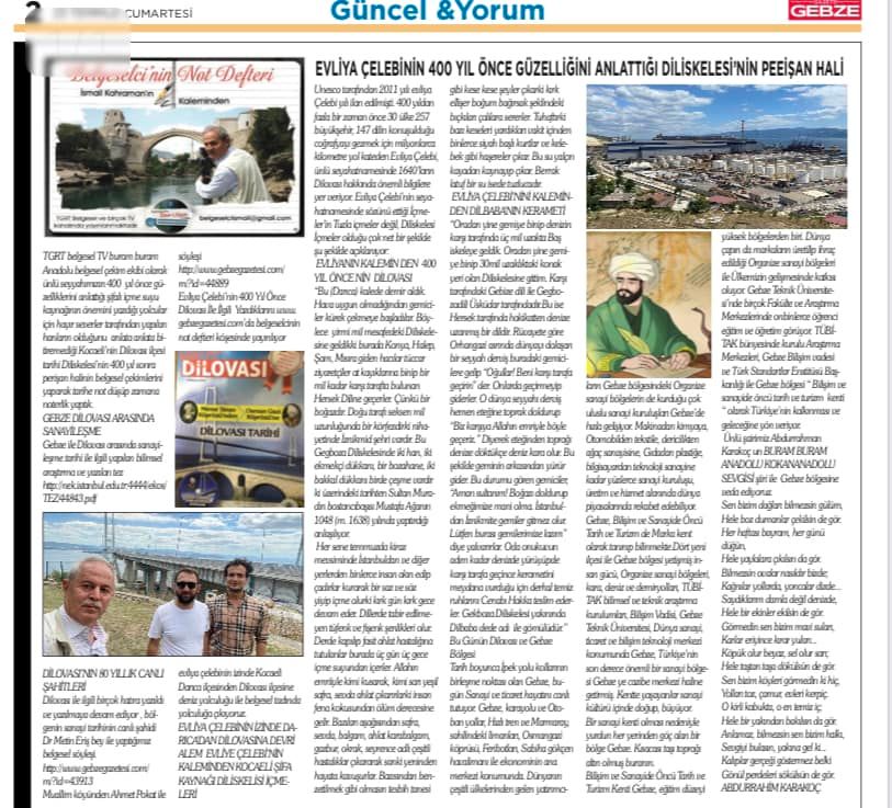 Evliya Çelebi’nin 400 Yıl Önce Dilovası İle İlgili Yazdıklarını www.gebzegazetesi.com’da belgeselcinin not defteri köşesinde yayınlıyor evliya çelebinin izinde Kocaeli Darıca ilçesinden Dilovası ilçesine deniz yolculuğu ile belgesel tadında yolculuğa çıkıyoruz.