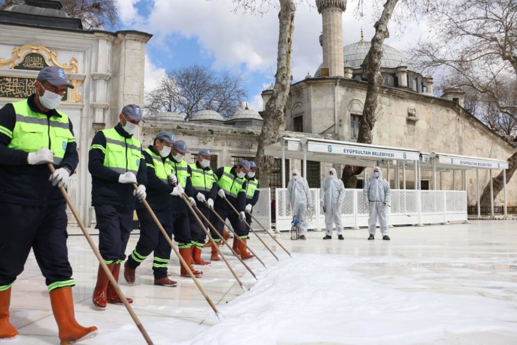 Yüzyıllardır Ramazan’ın en güzel şekilde yaşandığı, İslam aleminin gözbebeği Eyüpsultan’da Ramazan Ayı hazırlıkları kapsamında Eyüpsultan Camii Meydanı ve cami içerisi gül suyu ile yıkandı, temizlendi. Caminin içerisi, avlusu, abdest alma yerleri Eyüpsultan Belediyesi dezenfeksiyon ekipleri tarafından dezenfekte edildi.