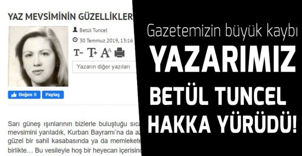 Gazetemizde uzun yıllar, değişik konularda yazı yazan, gazetemizin yazı ailesinden, iyi insan, değerli çalışma arkadaşımız, Betül Tuncel’i kaybettik. Hanımefendi kişiliği ile herkesin takdirini kazanan, yazdığı yazılarla gökkubede hoş sedalar bırakan Betül Tuncel’in ani vefatı, gazetemiz ve okur camiasında büyük üzüntüye neden oldu. Bir erkek evladı olan ve geçtiğimiz yıl oğlunu evlendiren Betül Tuncel, Sabri Tuncel’le evliydi. Betül Tuncel'in cenazesi bugün 12 Kasım 2019’da ikindi namazına müteakip Karacaahmet Mezarlığı'ndan kaldırılacaktır.