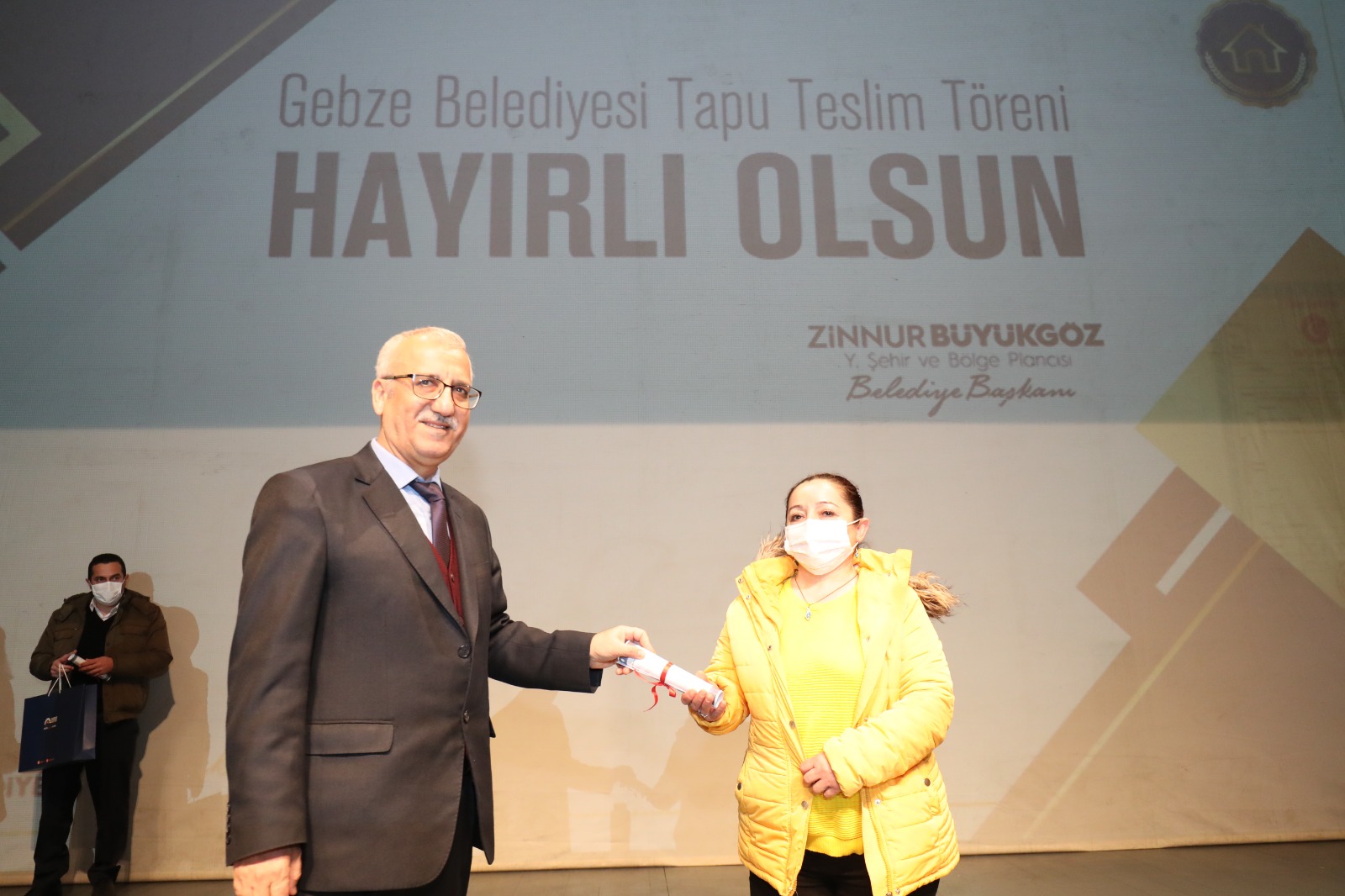 Gebze’de Mollafenari’de tapular Başkan Büyükgöz’den. Gebze’nin mahallelerinde imar şuyulandırma çalışmalarına ara vermeden devam eden Gebze Belediye Başkanı Zinnur Büyükgöz, hak sahiplerine tapularını düzenlenen törenlerle takdim ediyor. Osman Hamdi Bey Kültür Merkezi Salonunda düzenlenen tapu teslim törenine ev sahibi Gebze Belediye Başkanı Zinnur Büyükgöz’ün yanı sıra Kocaeli Büyükşehir Belediyesi Başkan Vekili Yaşar Çakmak, AK Parti İlçe Başkanı Recep Kaya, İlçe Kadın Kolları Başkanı Habibe Çırak, Gebze Tapu Müdürü Ekrem Kumuşoğlu, Gebze Nüfus Müdürü Hasan Aydın, belediye başkan yardımcıları, belediye meclis üyeleri, hak sahipleri ve vatandaşlar katıldı.