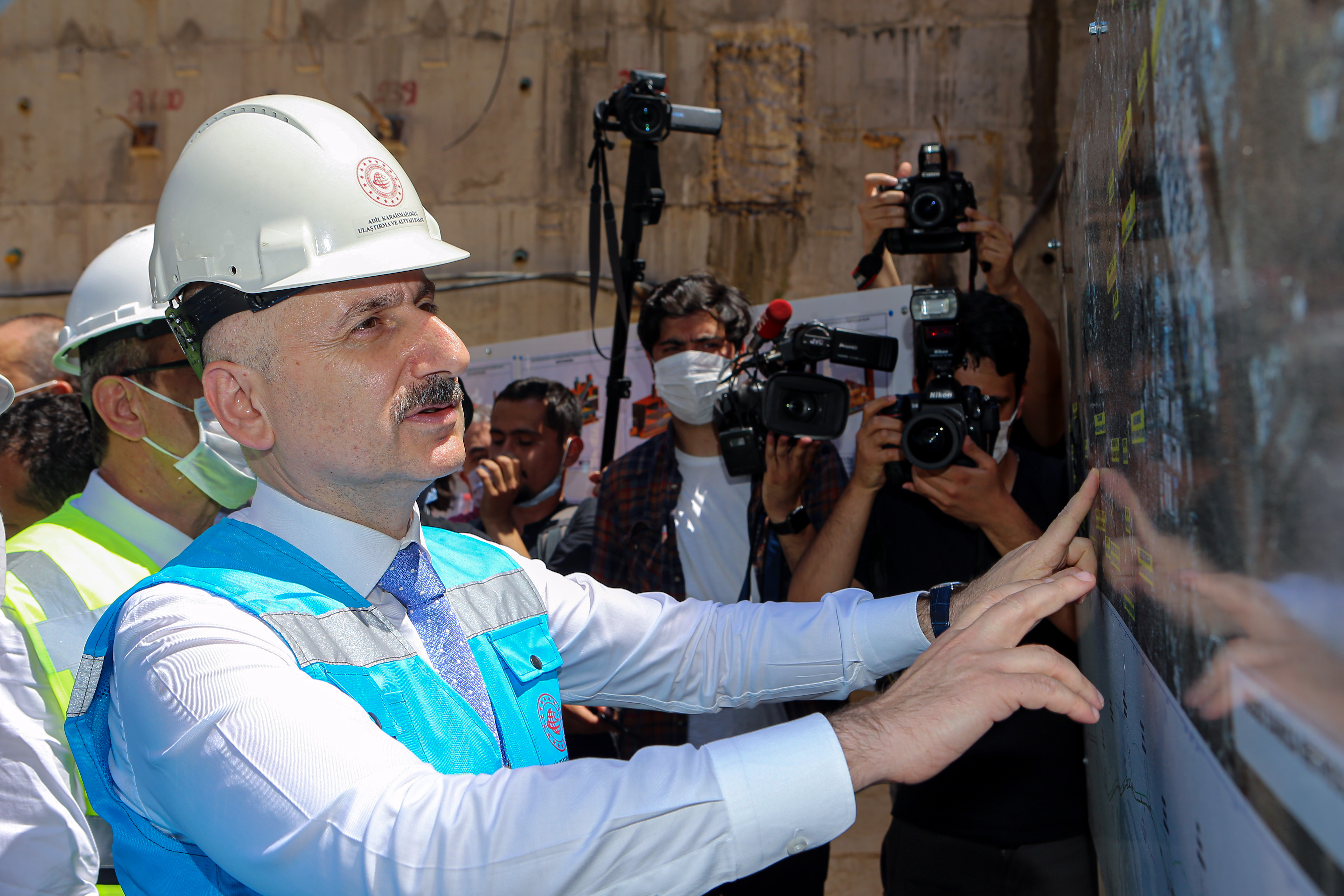 Ulaştırma ve Altyapı Bakanı Adil Karaismailoğlu (ortada), Gebze OSB-Darıca Sahil Yolu Metrosu şantiyesinde incelemelerde bulunarak açıklama yaptı. Bakan Karaismailoğlu'na Kocaeli Valisi Seddar Yavuz (solda) ve Kocaeli Büyükşehir Belediye Başkanı Tahir Büyükakın da (sağda) eşlik etti.