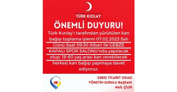 ÖNEMLİ DEĞİŞİKLİK Türk Kızılay’ı tarafından yürütülen kan bağışı toplama işlemi 07.02.2023 Salı Günü Saat 09:30 itibari ile GEBZE KAPALI SPOR SALONU’nda yapılacak olup; 18-60 yaş arası kan verebilecek herkesi kan bağışı yapmaya davet ediyoruz.