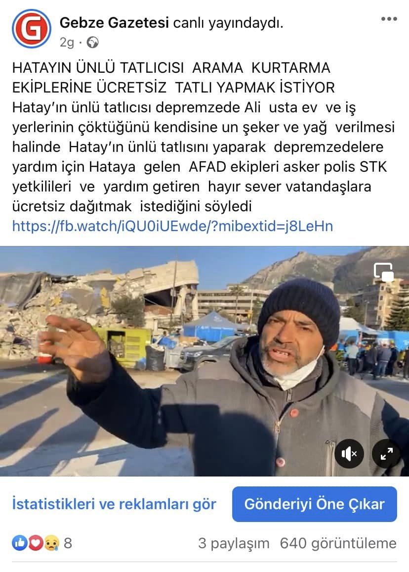 Hatay’ın ünlü tatlıcısı depremzede Ali usta ev ve iş yerlerinin çöktüğünü kendisine un şeker ve yağ verilmesi halinde Hatay’ın ünlü tatlısını yaparak depremzedelere yardım için Hataya gelen AFAD ekipleri asker polis STK yetkilileri ve yardım getiren hayır sever vatandaşlara ücretsiz dağıtmak istediğini söyledi https://fb.watch/iQU0iUEwde/?mibextid=j8LeHn
