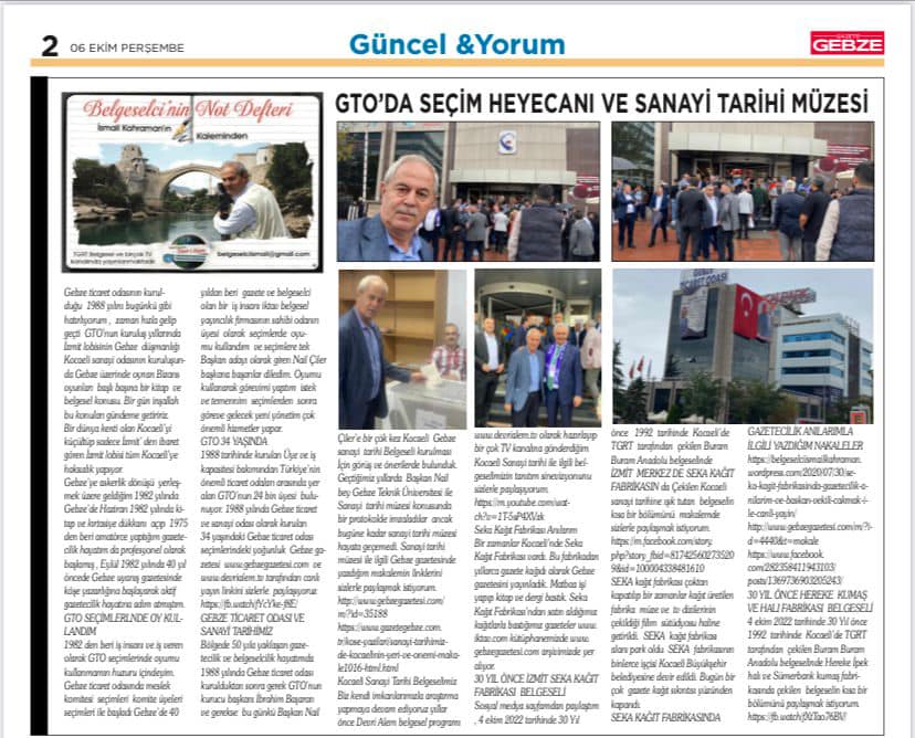 Bölgede 50 yıla yaklaşan gazetecilik ve belgeselcilik hayatımda 1988 yılında Gebze ticaret odası kurulduktan sonra gerek GTO’nun kurucu başkanı İbrahim Başaran ve gerekse bu günkü Başkan Nail Çiler’e bir çök kez Kocaeli Gebze sanayi tarihi Belgeseli kurulması İçin görüş ve önerilerde bulunduk.