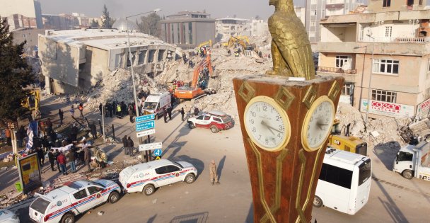 Depremin vurduğu Adıyaman’da, şehir merkezinde neredeyse tüm binalar yıkıldı ancak 40 yıllık saat kulesi enkazların arasında dimdik ayakta durdu. Kartal figürlü kulenin tarihi saati de depremin yaşandığı 04.17’yi göstermeyi sürdürüyor.