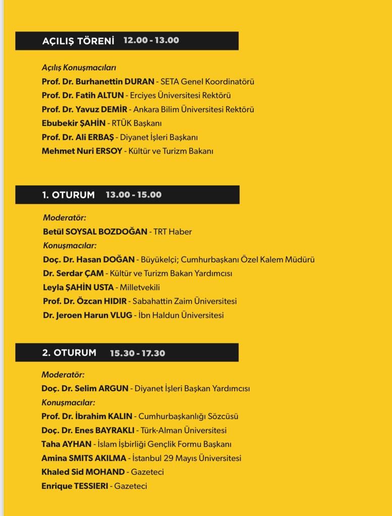 İlk oturumda Doç. Dr. Hasan Doğan, Dr. Serdar Çam, Prof. Dr. Özcan Hıdır, Dr. Jaroen Harun Vlug ve Milletvekili Leyla Şahin Usta panelist olarak yer alacak.
