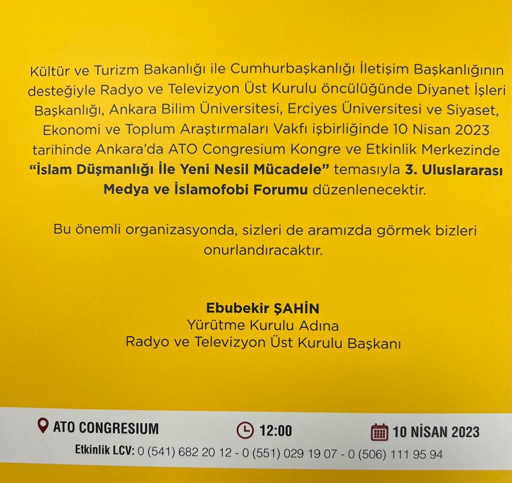İlki 3 yıl önce Cumhurbaşkanı Recep Tayyip Erdoğan tarafından başlatılan Medya ve İslamofobi Panelinin üçüncüsü bu yıl “İslam Düşmanlığıyla Yeni Nesil Mücadele” temasıyla 10 Nisan 2023 tarihinde ATO Congresium’da gerçekleştirilecek.