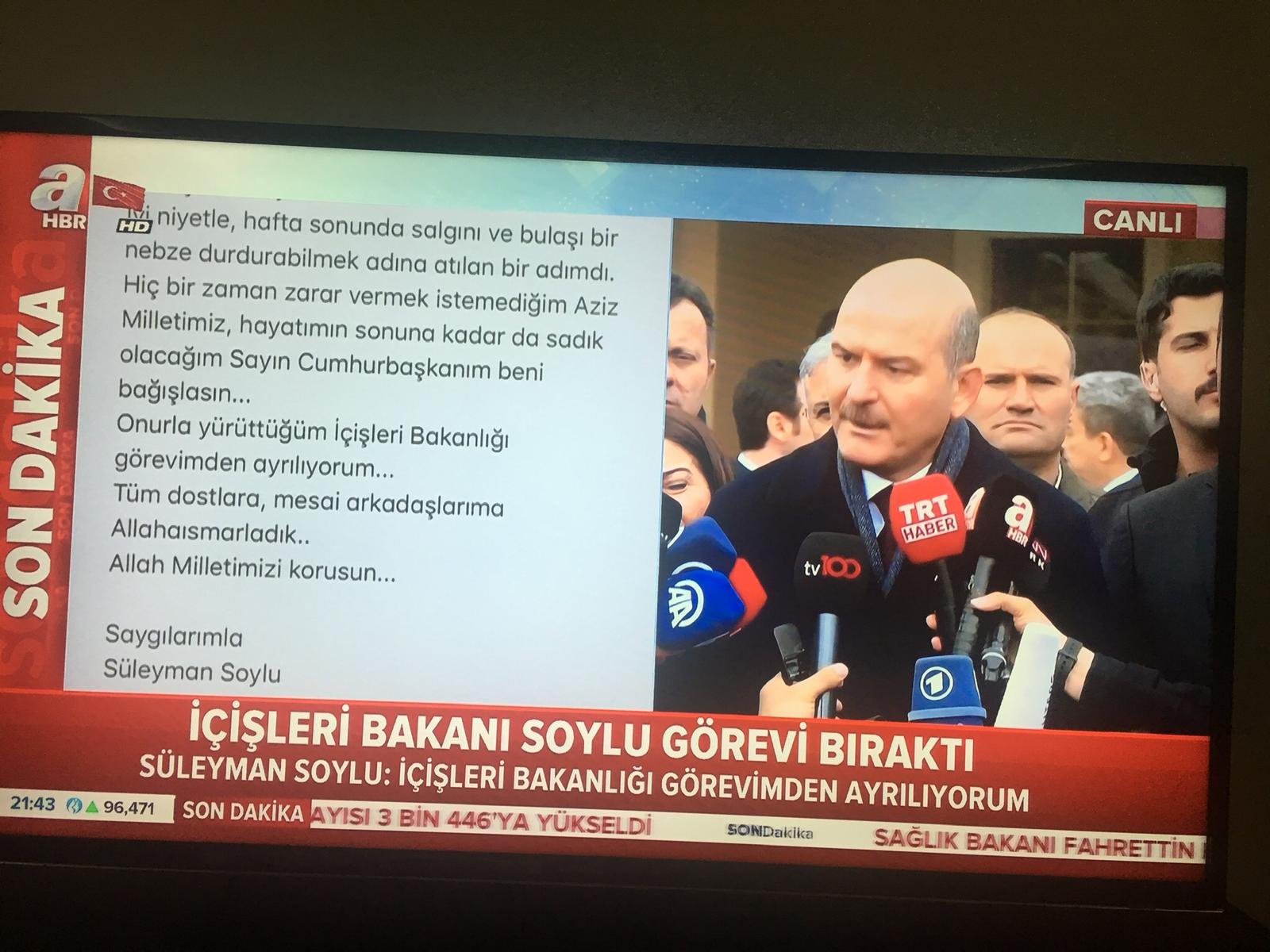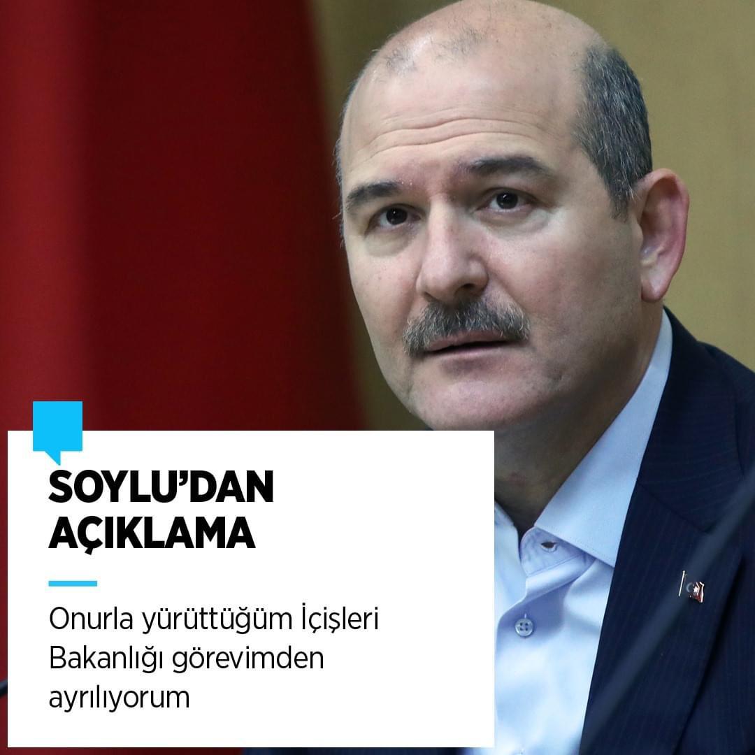 ''Gayretle ve titizlikle yürütülen bir süreçte, tamamen salgının önlenmesine yönelik hafta sonu sokağa çıkma yasağı kararının uygulanmasının sorumluluğu her yönüyle şahsıma aittir. Başlangıçta kısıtlı saatlerde de olsa ortaya çıkan görüntüler, mükemmel yönetilen bu süreçle uyuşmadı. Yaşadığım onca tecrübe, sorumluluk kısmı üzerimizde olan bu olayda, böyle görüntülere yol açmamalıydı. İyi niyetle, hafta sonunda salgını ve bulaşı bir nebze durdurabilmek adına atılan bir adımdı. Hiçbir zaman zarar vermek istemediğim aziz milletimiz, hayatımın sonuna kadar da sadık olacağım Sayın Cumhurbaşkanım beni bağışlasın. Onurla yürüttüğüm İçişleri Bakanlığı görevimden ayrılıyorum. Tüm dostlara, mesai arkadaşlarıma Allahaısmarladık. Allah milletimizi korusun.