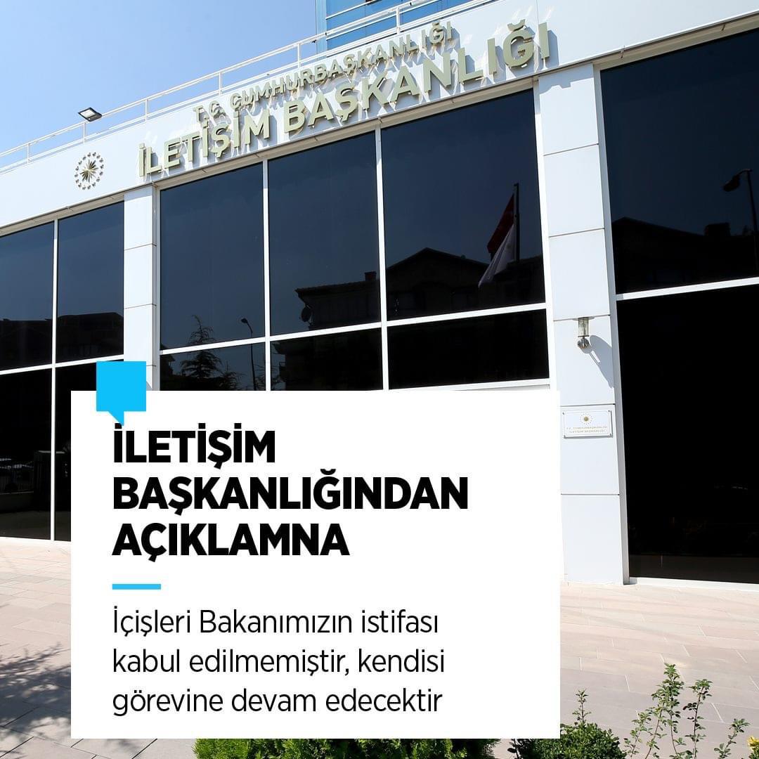 Bu açıklamadan 2 saat 23 dakika sonra Cumhurbaşkanlığı iletişim Başkanlığı tarafından kısa bir açıklama ile istifanın kabul edilmediği açıklandı