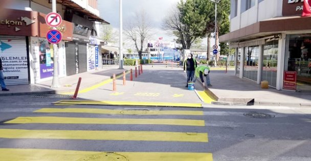 Salgına karşı ilçe genelinde temizlik ve dezenfeksiyon çalışmalarına titizlikle devam eden belediye ekipleri, yaya geçitleri, engelli park yerleri ve kaldırımlarda da bakım ve onarım yapıyor.
