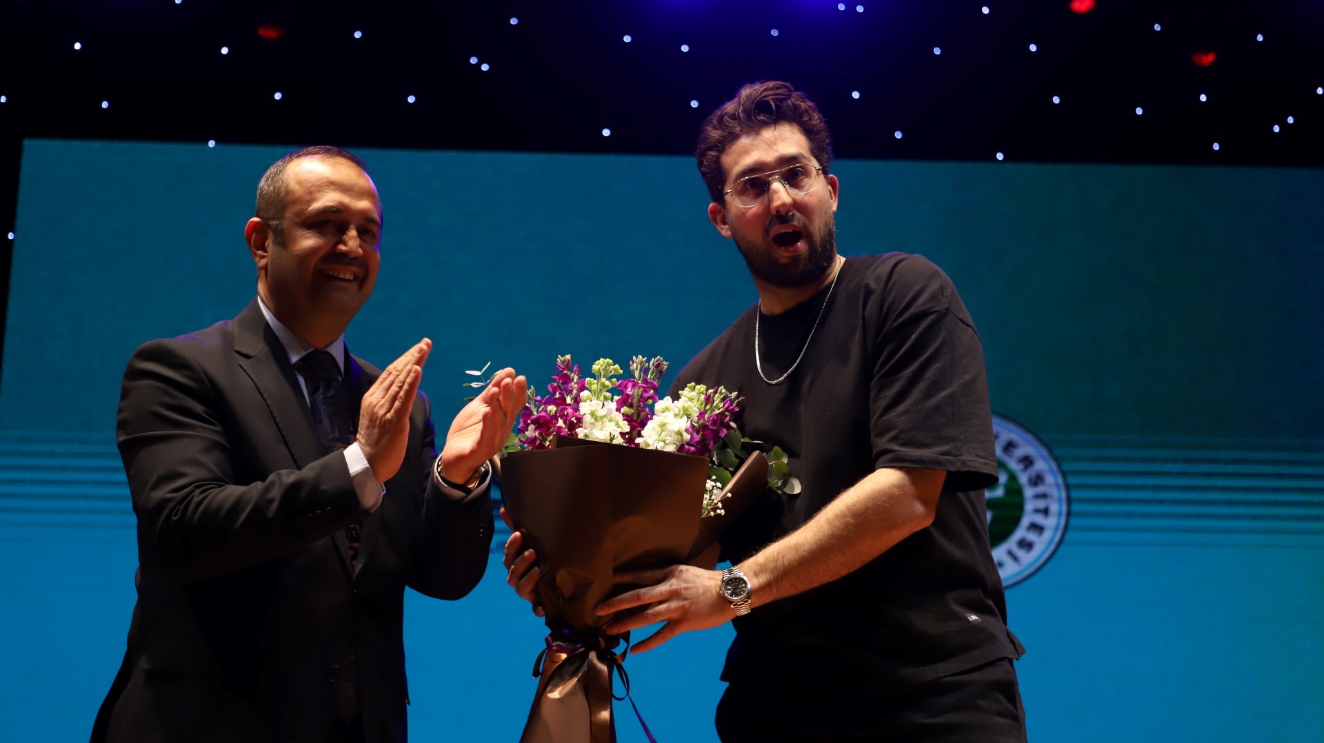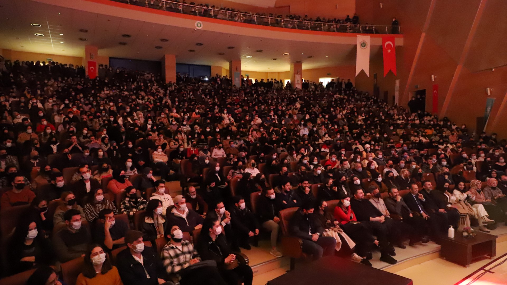 Konuşmanın ardından Doğu Demirkol alkışlar arasında sahneye gelerek gösterisine başladı. Bir saat 15 dakika sahnede kalan Demirkol, gösterisinde kendi hayatından kesitleri esprili örneklerle anlattı. Yönetmen Nuri Bilge Ceylan’ın “Ahlat Ağacı” filminde başrol oynayan Demirkol, sette yaşadığı anılarını da yine kendine has üslubuyla öğrencilerle paylaştı.