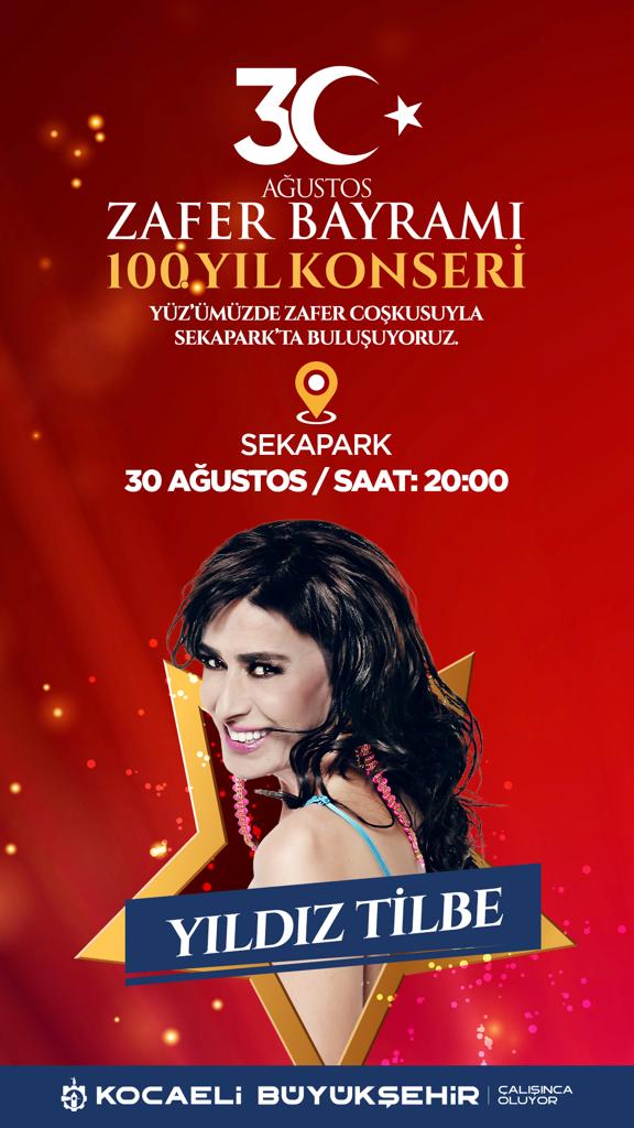 Kocaeli Büyükşehir Belediyesi, Türk ulusunun bağımsızlık mücadelesindeki en önemli dönüm noktalarından biri olan 30 Ağustos Zafer Bayramı’nı düzenleyeceği etkinlik ve konserlerle kutlayacak. Sevilen sanatçı Yıldız Tilbe büyük zaferin 100. yıl dönümü dolayısıyla düzenlenen etkinlikler kapsamında sahne alacak. Konserler, 30 Ağustos Zafer Bayramı’na coşku katacak.
