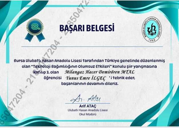 kurumlarında eğitim gören öğrencilere yönelik "Teknoloji Bağımlılığının Olumsuz Etkileri" konulu şiir yarışması düzenlendi. Yarışmaya Milangaz Hacer Demirören Mesleki ve Teknik Anadolu Lisesi Ulaştırma alanı 10. sınıf öğrencisi Yunus Emre İLGEÇ’te katıldı. Okulunu ve ilimizi başarıyla temsil eden Yunus Emre İLGEÇ yarışmada 3. olarak okulunu ve İLGEÇ ailesini sevince boğdu.