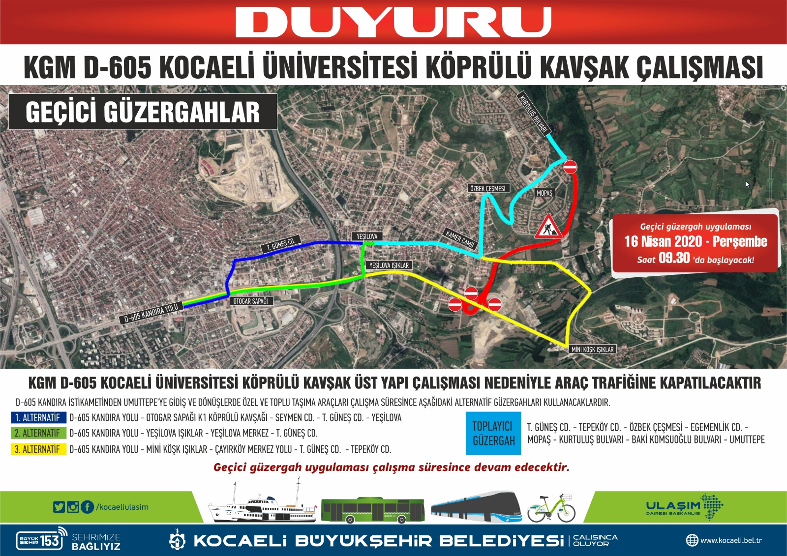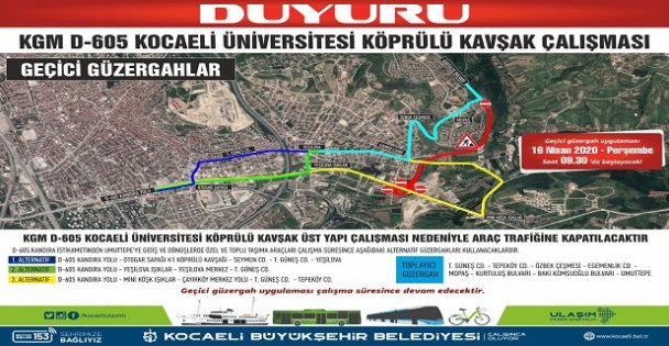 Karayolları Genel Müdürlüğü’nün D-605 karayolu, Kocaeli Üniversitesi köprülü kavşak üst yapı çalışması nedeniyle araç trafiğine kapatacak. Kocaeli Büyükşehir Belediyesi bölgeyi kullanan toplu taşıma araçları ve özel araçlar için geçici güzergah oluşturdu.