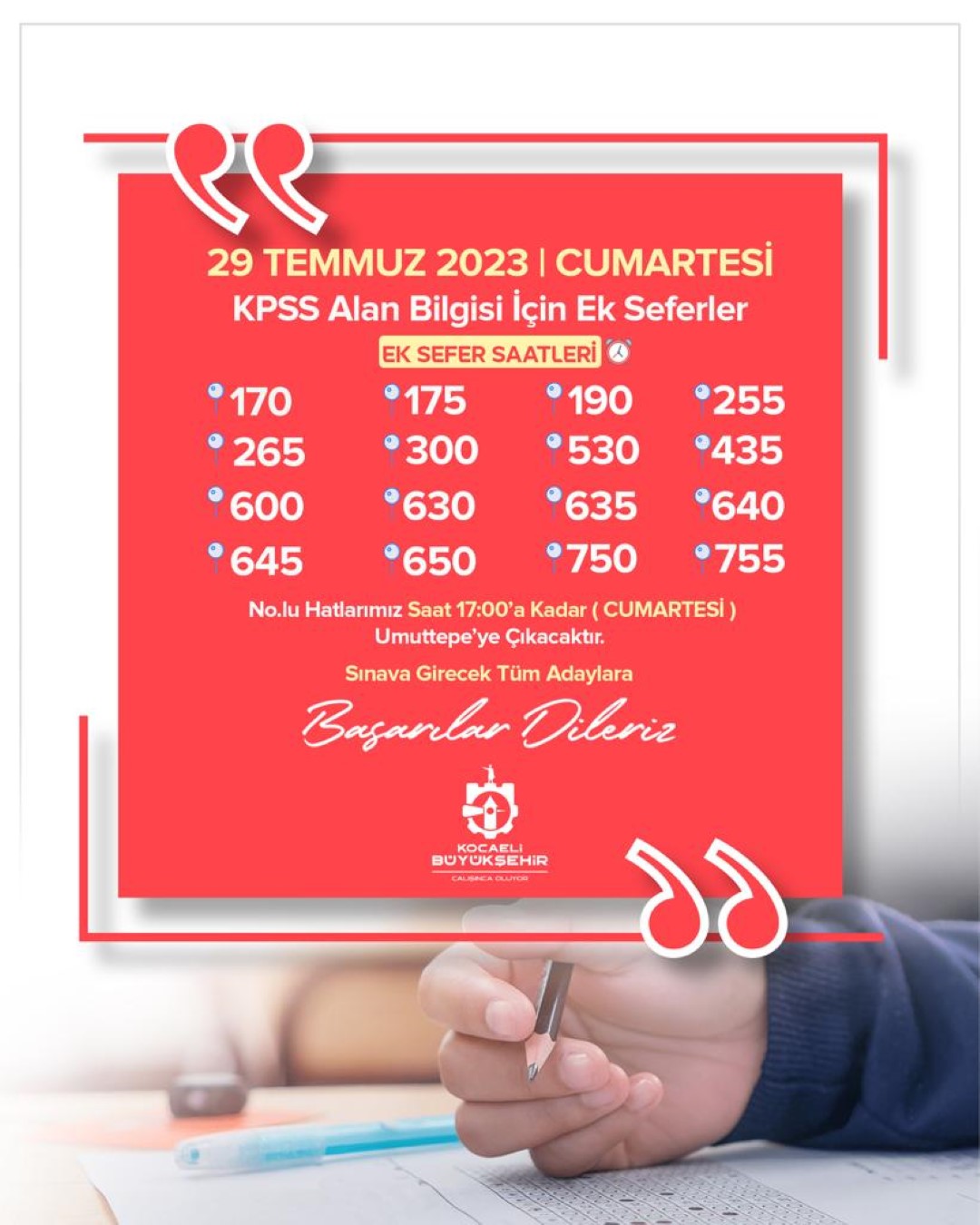 Ulaşım Dairesi Başkanlığı, 29 Temmuz Cumartesi ve 30 Temmuz Pazar günü gerçekleşecek Kamu Personeli Seçme Sınavı’na (KPSS) özel ek sefer düzenleyecek. Sınava girecek adayların herhangi bir olumsuzluk yaşamaması için bu kapsamda 170, 175, 190, 255, 265, 300, 435, 530, 600, 630, 635, 640, 645, 650, 750 ve 755 No’lu hatlar 2 gün ek sefer uygulanacak. Ayrıca ek sefer yapılacak hatlar saat 17.00'ye kadar Umuttepe'ye çıkacak.