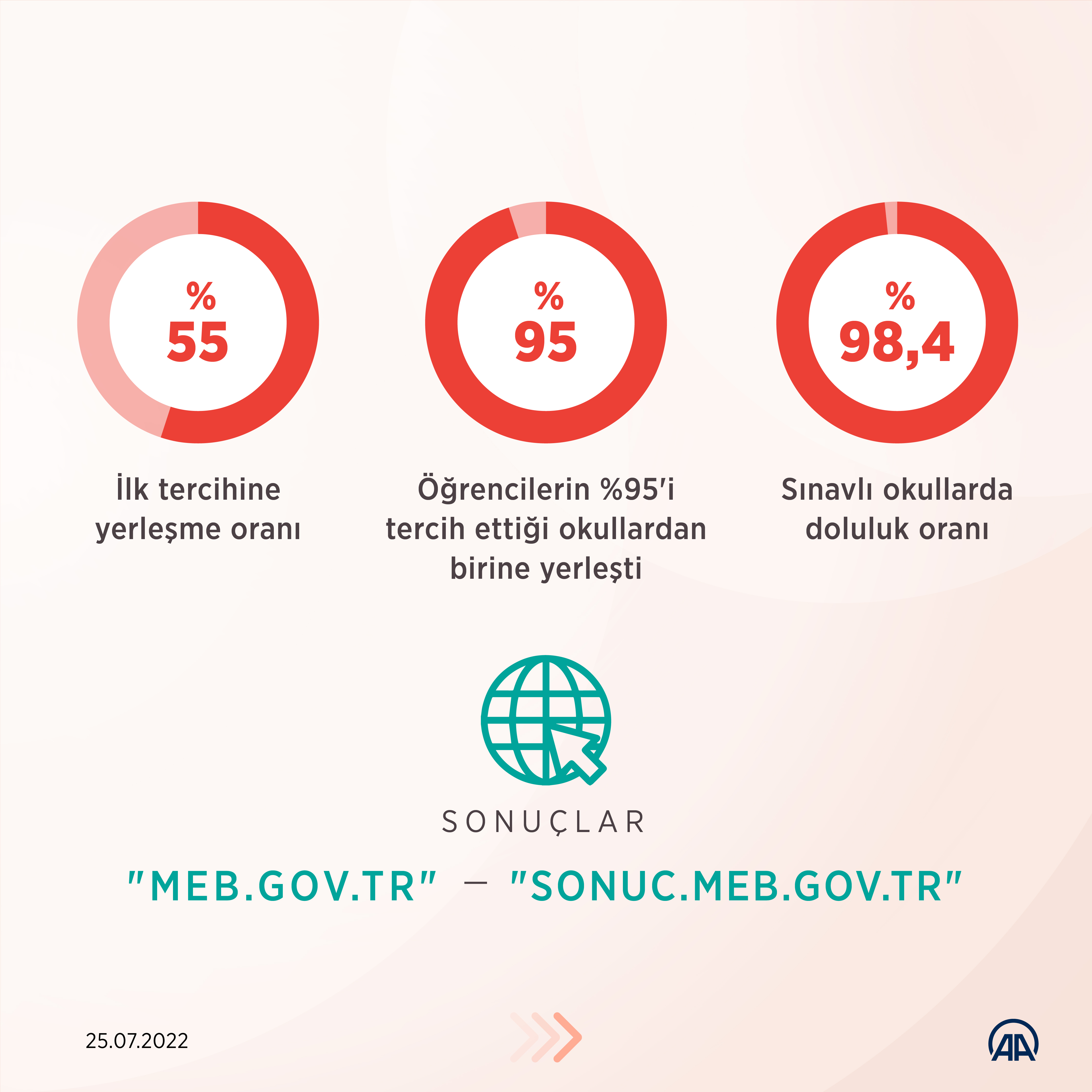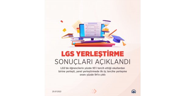 LGS yerleştirme sonuçları açıklandı (GRAFİK)LGS'de öğrencilerin yüzde 95'i tercih ettiği okullardan birine yerleşti, yerel yerleştirmede ilk üç tercihe yerleşme oranı yüzde 94'e çıktı. 25 Temmuz 2022 Pazartesi 11:55 Facebook'ta Paylaş Tweetle Google+ Paylaş