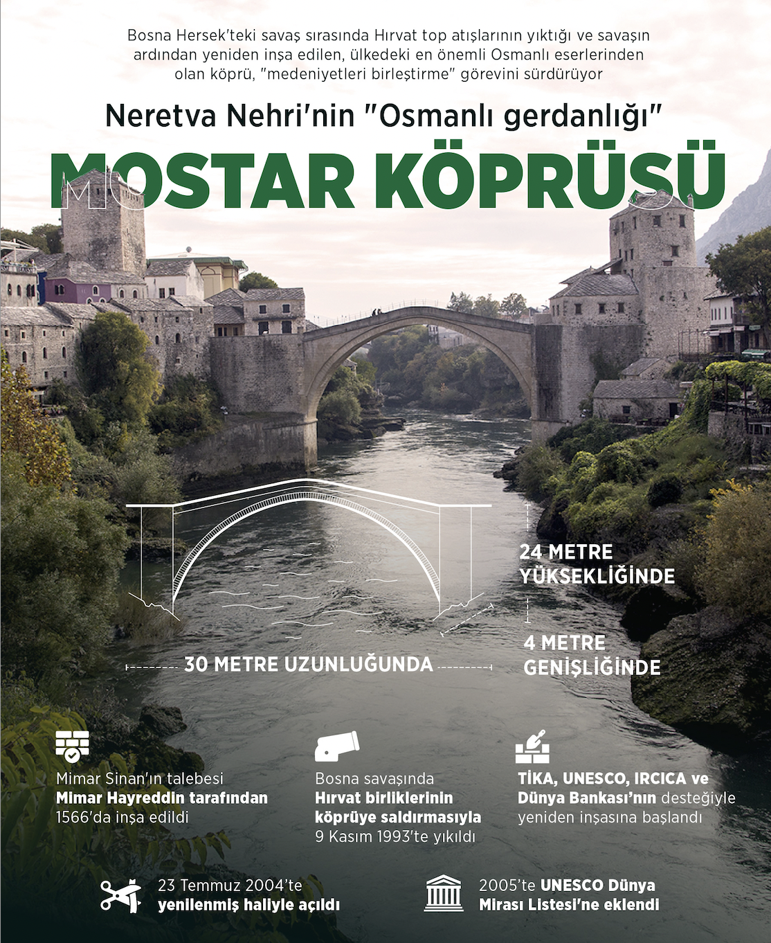 Bosna Hersek'teki savaşta (1992-1995) Hırvat birliklerince, 29 yıl önce yıkılan ancak savaşın ardından yeniden inşa edilen, Neretva Nehri'nin "Osmanlı gerdanlığı" olarak adlandırılan ve "medeniyetleri birleştiren" tarihi Mostar Köprüsü bu misyonunu bugün de sürdürüyor.