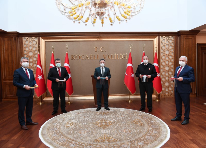 Valimiz Sayın Hüseyin Aksoy, görevleri sırasında daha güvenli çalışmalarına imkân sağlayacak olan siperlikli maskelerin teslimi sırasında yapmış olduğu konuşmalarında; “Kocaeli Milli Eğitim Müdürlüğümüz koronavirüs ile mücadele kapsamında okullarımızda önemli çalışmalar ortaya koyuyor. Maske üretimi konusunda bugüne kadar yaklaşık olarak 410 bin maske üreterek, ihtiyaç sahibi kurumlarımıza teslim etmiştir. Dezenfekte üretimi de devam edilmektedir. Biraz önce dağıtımını gerçekleştirdiğimiz siperlikli maskelerden yaklaşık 5 bin adet üretim gerçekleştirilerek, ihtiyacı olan kurumlarımıza göndermiştir. Bugün de, İl Milli Eğitim Müdürlüğümüzün koordinasyonunda okullarımızda hazırlanan bu maskeleri İl Emniyet Müdürlüğümüze ve İl Jandarma Komutanlığımıza teslim ediyoruz. Görevlerinde daha güvenli bir şekilde çalışmalarına imkan sağlayacak bu maskeleri kullanarak, daha iyi bir hizmeti sunmalarını bekliyoruz ve istiyoruz. Ben bu vesileyle güvenlik birimlerimize de yürüttükleri özverili çalışmalardan dolayı teşekkür ediyorum. Koronavirüs ile mücadele kapsamında sağlık çalışanlarımız büyük bir gayret içerisinde çalışmalarını sürdürüyor, onlara da yapmış oldukları bu özverili ve fedakarca çalışmalardan dolayı teşekkür ediyorum. Milli Eğitim Müdürlüğümüz gibi birçok kurumumuz da bu çalışmalara destek amaçlı çeşitli katkılar ortaya koymaktadır. Bu anlamda da Milli Eğitim Müdürlüğümüze ve diğer bütün kurumlarımıza teşekkür ediyorum. Büyükşehir belediyemiz, ilçe belediyelerimiz, üniversitelerimiz ve diğer kurumlarımızla işbirliği içerisinde Kocaeli'de önemli çalışmalar gerçekleştiriyoruz.” diyen Sayın Valimiz, Koronovirüsle mücadeleye katkısı olan bütün kurum ve kişilere de teşekkür ederek, okullarımızda üretimi gerçekleştirilen 5 bin adet siperlikli maskeyi İl Emniyet Müdürü Veysal Tipioğlu ve İl Jandarma Komutanı Albay Osman Aslan’a teslim etti.