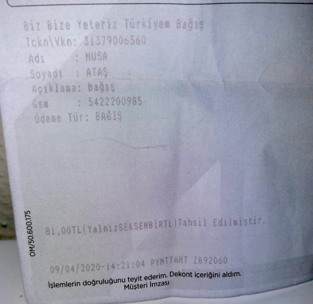 Kocaeli’nin İzmit ilçesi Alikahya Mahallesinde ikamet eden özel öğrenci Musa Ataş biriktirdiği paraları “Biz Bize Yeteriz Türkiyem” kampanyasına bağışlayarak “Virüs sebebiyle para biriktirdim, bunu devletimize bağışlayacağız. Cumhurbaşkanımız Recep Tayyip Erdoğan’a ve Kocaeli Büyükşehir Belediye Başkanımıza teşekkür ederim” şeklinde konuştu.