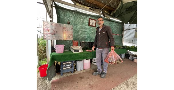 - Başiskele ilçesinde bir çiftçinin devlet desteğiyle oluşturduğu seraya gelenler, dalından topladıkları ürünü kendileri tartarak parasını üzerinde "kasa" yazan kovaya bırakıyor