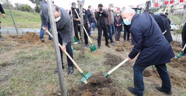 töreninde Gebze Belediye Başkanı Zinnur Büyükgöz ve sağlık çalışanları fidanları birlikte toprakla