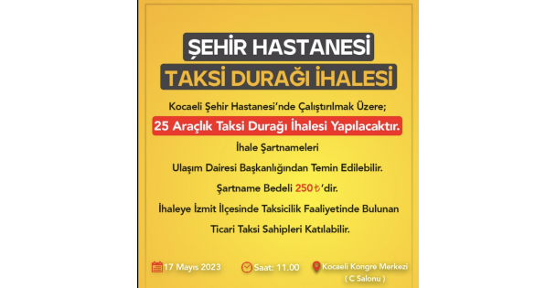 17 Mayıs tarihinde Kocaeli Kongre Merkezi C Salonunda gerçekleştirilecek ihale 25 araçlık olacak. İzmit İlçesi Şehir hastanesinde çalıştırılacak taksi durağı ihalesine İzmit ilçesinde faaliyet gösteren taksi sahipleri katılabilecek. İhale şartnameleri 08 Mayıs Pazartesi günü itibariyle Ulaşım Dairesi Başkanlığından alınabilecek.