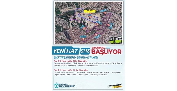 Kocaeli Büyükşehir Belediyesi Nisan ayının ilk haftasında hasta kabulüne başlayan Kocaeli Şehir Hastanesi için ulaşım planlarını düzenlemeye devam ediyor. Ulaşım dairesi başkanlığı daha önce Kocaeli Şehir Hastanesi için 8 yeni hat kurmuştu. Vatandaşların rahat ve hızlı ulaşımı için SH3 hattı da pazartesi günü seferlerine başlayacak. SH3 gidiş güzergahı; Tavşantepe Caddesi, Dilek Sokak, Ata Sokak, Gülcanlar Sokak, Okan Sokak, Demir Sokak, Cephanelik, Kocaeli Şehir Hastanesi. SH3 dönüş güzergahı;