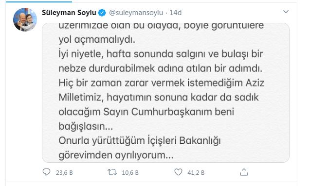 Süleyman Soylu İstifa EttiSüleyman Soylu İstifa Etti 12 Nisan 2020 Pazar 21:38 Türkiye Cumhuriyeti İç iŞleri Bakanı Süleyman Soylu istifa etti Twitter hesabı üzerinden yaptığı açıklamayla istifa etti Facebook'ta Paylaş Tweetle Google+ Paylaş