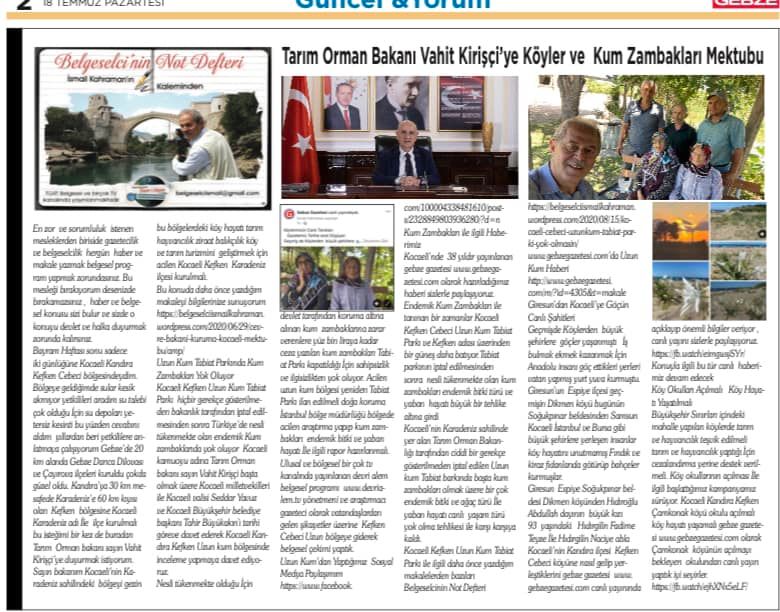 Bayram Haftası sonu sadece iki günlüğüne Kocaeli Kandıra Kefken Cebeci bölgesindeydim. Bölgeye geldiğimde sular kesik akmıyor yetkilileri aradım su talebi çok olduğu İçin su depoları yetersiz kesinti bu yüzden cevabını aldım yıllardan beri yetkililere anlatmaya çalışıyorum Gebze’de 20 km alanda Gebze Darıca Dilovası ve Çayırova ilçeleri kuruldu çokda güzel oldu. Kandıra’ya 30 km mesafede Karadeniz’e 60 km kıyısı olan Kefken bölgesine Kocaeli Karadeniz adı İle ilçe kurulmalı bu isteğimi bir kez de buradan Tarım Orman bakanı sayın Vahit Kirişçi’ye duyurmak istiyorum.