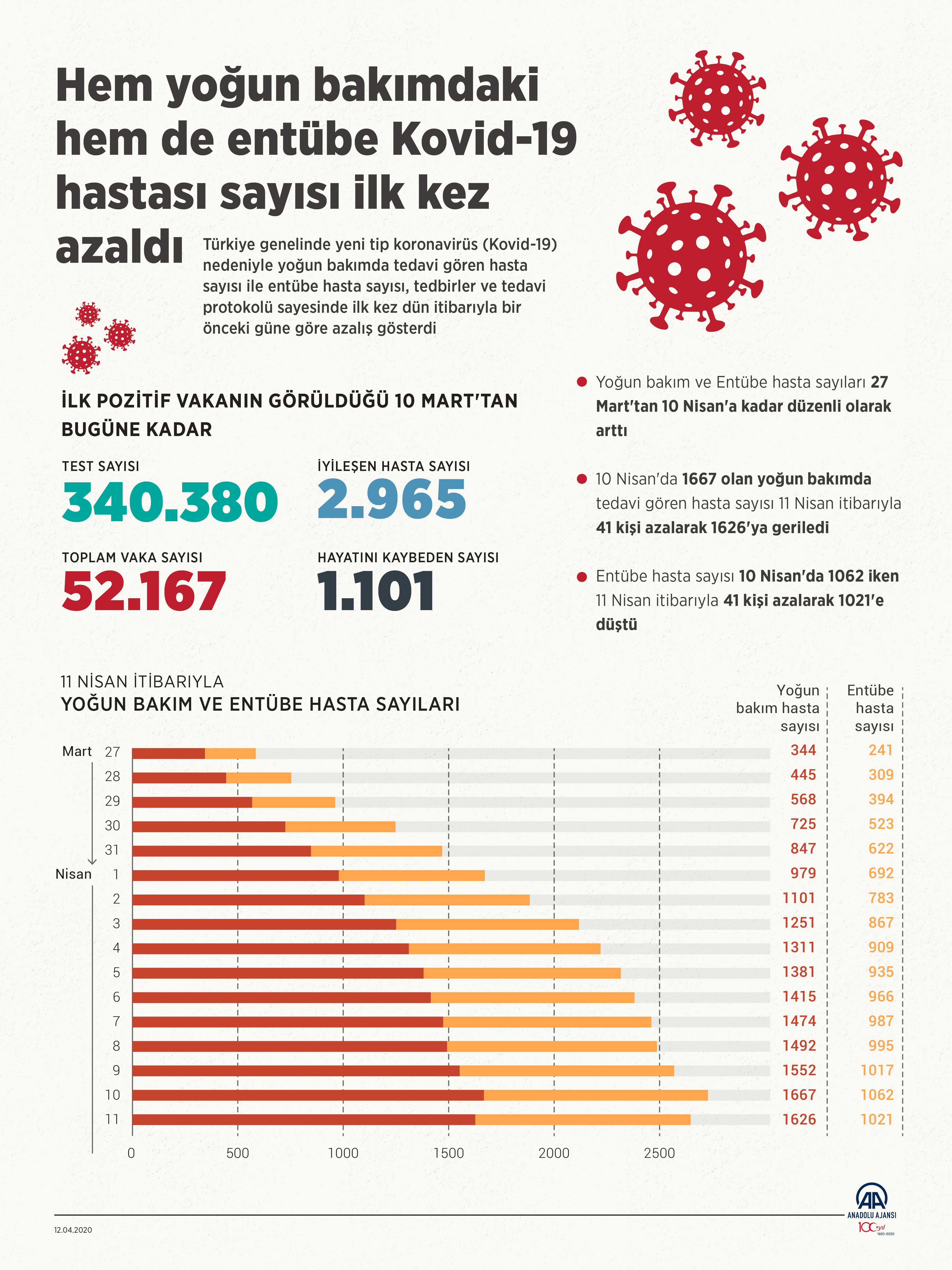 Türkiye genelinde yeni tip koronavirüs (Kovid-19) nedeniyle yoğun bakımda tedavi gören hasta sayısı ile entübe hasta sayısı, tedbirler ve tedavi protokolü sayesinde ilk kez dün itibarıyla bir önceki güne göre azalış gösterdi.