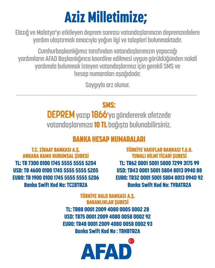 Yardım yapmak isteyen duyarlı kişi ve kuruluşların nakdi yardımlarını 3 kamu bankasında açılan hesap numaraları aracılığıyla ve SMS ile (DEPREM yazıp 1866 gönderilmesi şeklinde) yapabileceklerinin vurgulandığı bilgilendirmede ayni yardımlar için gönderilecek malzemelerin kesinlikle kullanılmamış ve yeni olması gerekliliği hatılatıldı. Eski yardım malzemelerinin kabul edilmediği aktarılarak, özellikle üç başlıkta yardımların kabul edildiği iletildi.