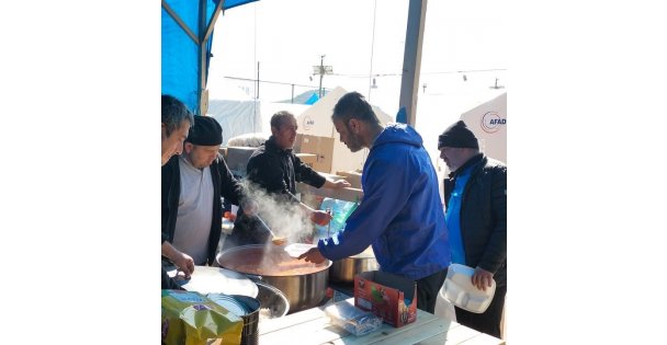 Derince Belediyesi Vefa Hattı ekipleri, Hatay'ın Defne ilçesinde kurduğu aşevinde depremzedelere sıcak yemek ikram ediyor.