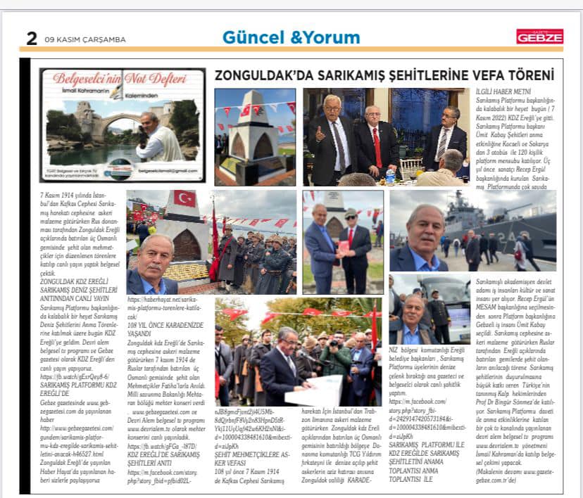 108 yıl önce 7 Kasım 1914 de Kafkas Cephesi Sarıkamış harekatı İçin İstanbul’dan Trabzon limanına askeri malzeme götürürken Zonguldak kdz Ereli açıklarından batırılan üç Osmanlı gemisinin batırıldığı bölgeye Donanma komutanlığı TCG Yıldırım fırkateyni ile denize açılıp şehit askerlerin aziz hatırası anısına Zonguldak valiliği KARADENİZ bölgesi komutanlığı Ereğli belediye başkanları , Sarıkamış Platformu üyelerinin denize çelenk bıraktığı ana gazeteci ve belgeselci olarak canlı şahitlik yaptım.