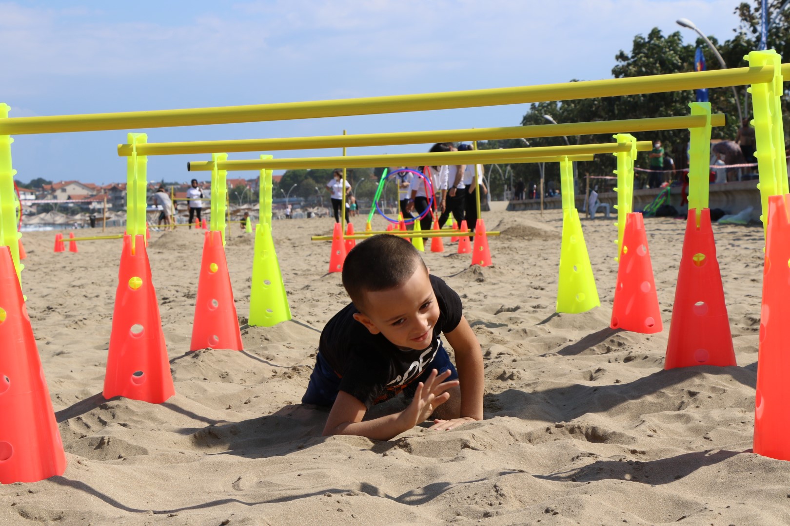 Sağlık ve Sosyal Hizmetler Dairesi Başkanlığı’nın düzenlediği Cebeci sahilindeki etkinlikte birçok aktiviteye yer verilirken kurulan parkurlarda çocuklar engellerin üstünden ve altından geçtikten sonra kazılan çukurun içinden geçip oluşturulan dairelerin içinden geçtiler. Bu zorlu aşamanın ardından yine engellerin altından sürünerek bitiş kısmına geldiler. En son kısım da ise meyvelerden oluşan puzzleları tek tek masaya dizerek parkuru tamamladılar.