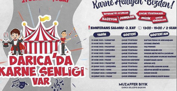 Darıca Belediyesi, 2022- 2023 yılı eğitim-öğretim döneminin ilk yarısı boyunca ter döken minikler için karne şenliği düzenleyecek. Karnelerini alarak 15 günlük tatile çıkacak öğrencilere sürpriz hazırlayan Darıca Belediyesi tarafından yarıyıl tatili boyunca gerçekleştirilecek şenlik ile çocuklar eğitim yılının tüm yorgunluğunu gönüllerince eğlenerek atacak. Şenlik çerçevesinde Darıca Belediyesi Adnan Menderes Kültür Merkezi’nde düzenlenecek etkinlikler 21 Ocak Cumartesi günü başlayacak. Çocuk tiyatroları, sinemalar, jonglör gösterileri, interaktif oyunlar ve illüzyon gösterilerinin sahneleneceği şenlik, çocuklara unutulmaz anlar yaşatacak.